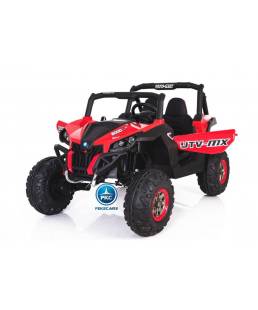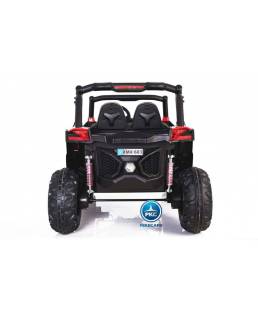 Este increíble todoterreno buggy UTV en color rojo está hecho para poder con todo. Con la innovadora pantalla MP4. Equipado con 4 potentes motores y ruedas de caucho antipinchazos lo que le permite ir por casi cualquier terreno. Si a estas características le sumas su acolchado asiento de polipiel con 5 puntos de anclaje y la suspensión a las 4 ruedas, tienes una conducción segura y cómoda en cualquier circunstancia. Por si fuera poco, es un coche muy espacioso de 2 plazas. Olvídate de una salida brusca gracias al mando radiocontrol 2.4G y alcanza una velocidad máxima de hasta 7km/h. Con luces LED delanteras y traseras. ¿Lo mejor de este todoterreno? Que incluye un asa stroller para que puedas transportar sus 26kg de peso con una sola mano.