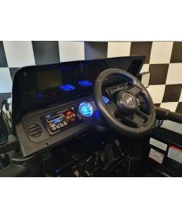 Viene equipado con neumáticos blandos de caucho y un asiento con acabado en piel para mayor confort en los paseos de los pequeños de la casa. También dispone de conexión bluetooth para reproducir música desde otro dispositivo, o si lo prefieres , puedes usar su Mp3 con conector USB, ranura para tarjeta SD y música pregrabada.