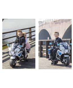 Hazte con la autentica moto eléctrica para niños de policía Bmw R1200 con sirenas, ruedas de goma eva, llave de arranque, maleteros y mucho más. Haz que tu hijo o hija se sienta como un autentico policía.